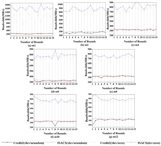 For the results of the DD test on /dev/zero, the VM configuration with the highest disk bandwidth increase rate is shown as “m4” in Figure 12c; the average bandwidth of the existing environment is approximately 738.2 MB, and the average bandwidth of ISACS is approximately 812.4 MB, which is 9.1% higher than that of the existing environment. In contrast, the VM configuration with the lowest average disk bandwidth increase rate for ISACS is “m2” in Figure 12b, and the corresponding value is 873.7MB, which is just 1.3% higher than compared with that of the existing environment. The reason for the low disk bandwidth increase rate is that the performance interference between vCPUs does not occur because the number of pCPUs is larger than that of vCPUs. From ”m12” in Figure 12g, we can observe that the disk bandwidth improvement rate of ISACS is low. This is because as the number of VMs increases, the number of vCPUs also increases, resulting in a lack of pCPU resources. However, when performing the DD test for /dev/zero in Figure 12, the overall disk bandwidth is increased according to each VM configuration. Therefore, ISACS can improve disk I/O performance in a mixed environment.