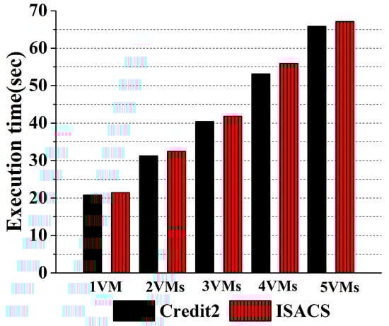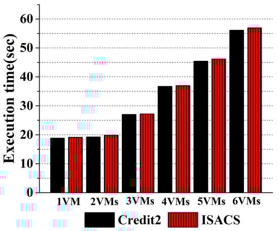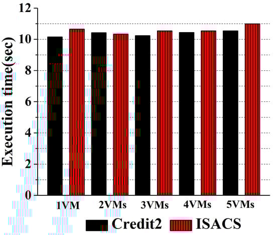 As shown in Figure 14, in the hybrid environment, the CPU task processing time of the target-VM is similar in the existing environment and in ISACS. However, as shown in Figure 15, in a mixed environment, ISACS entailed a slight delay compared to the existing environment. In the experiments, the largest differences in execution time for the existing environment and ISACS, in a hybrid environment, are 10.14 s and 10.65 s respectively. For the mixed environment, these are 53.12 s and 55.94 s respectively when four VMs are running. For the above two experimental results, ISACS appears the execution time with 0.95x approximately in speed-up than that of existing environment. The reason for the lower CPU performance of the target-VM in a mixed environment than that in the existing environment is that the vCPUs of the VMs other than those of the target-VM are assigned IVCredits for each scheduling round due to I/O handling. Because I/O-intensive vCPUs are assigned IVCredits immediately after the credit reallocation, which leads to a higher amount of credits on average for vCPUs other than those of the target-VM, the scheduling priority of the vCPUs of the target-VM in the mixed environment is lower in the experiment. In the experiments, the However, the difference in the execution time of Sysbench is very small and thus is negligible.