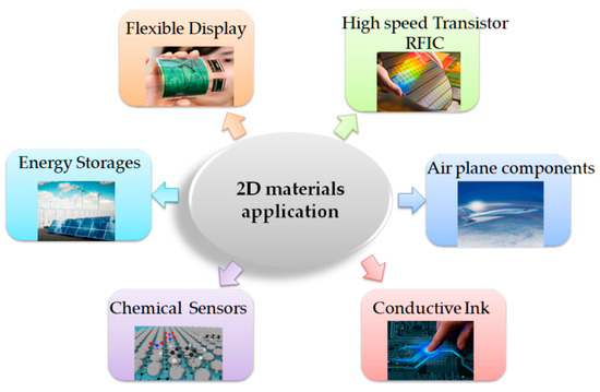 Since graphene was discovered, more and more 2D (two-dimensional) materials have been found, such as TMDs (Transition Metal Dichalcogenides), BP (Black Phosphorus), etc. [1,2,3,4]. Like graphene, few layered 2D materials can be obtained by mechanical exfoliation [5]. At present, there are mainly four types of 2D layered materials. The first type is the graphene-like family, including graphene, boron nitride, etc. The second type is the 2D transition metal dichalcogenides family, including the semiconductor dichalcogenides and the metal dichalcogenides. The third type is the 2D oxide family, which mainly consists of some layered oxides. Finally, there are some layered materials of other structures, like as black phosphorus [6]. These 2D materials have different properties, such as graphene, which is a Dirac semi-metal, and transition metal dichalcogenides, which is an excellent semiconductor, while boron nitride is an excellent insulator. These transition metal dichalcogenides not only have the mechanical, electrical, and optical advantages of graphene, but also have the natural optical band gap that graphene does not have. Therefore, they have been the research hotspots in the field of materials science in the past few years. With the rapid development of the semiconductor industry, the high integration of electronic components is further increased. Because of the approximation to the limit of Moore’s law, the application of traditional semiconductor has become increasingly restricted. At the same time, the varied physical properties of 2D materials displayed superior performance, and 2D materials are expected to instead of some traditional semiconductor materials (Figure 1). In the post-Moore circuit era, 2D materials will create a new path for the development of photoelectric applications [7,8,9].