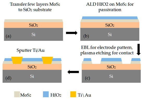 Fabrication process of edge-contacted 2D material back-gate FET (a) Transfer MoS2 to substrate; (b) ALD HfO2 for passivation; (c) Etching for contact; (d) Sputter Ti/Au.