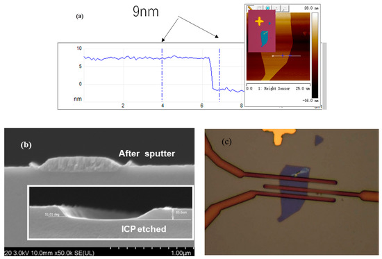Figure 3 shows the fabrication process flow and the cross-sectional schematic of our device structure. MoS2 samples were exfoliated from a bulk MoS2 crystal using the conventional mechanical exfoliation method. The samples were transferred on a clean SiO2 (285 nm) highly doped Si substrate (Figure 3a), and the thickness as identified by AFM (atomic force microscopy) (Figure 4a). We used 7 nm, 9 nm, 15 nm, 20 nm varied thickness of MoS2 for 2D material FETs channel. During the fabrication process, the MoS2 samples were covered HfO2 (30 nm) by ALD (atomic layer deposition) equipment, in order to avoid any possible degradation upon longer exposure to air. We used resist AR-P6200/PMMA as the etch mask. The top layer was coated with AR-P 6200 of layer thickness ≈220 nm and the sample was pre-baked at 150 °C for 3 min. The mask was defined on the top lay by EBL (electron-beam lithography). The etching was performed in ICP380 with a gas Ar. Suitable etching times for the desired grating depths were found out during the process. In the etching process, through adjusting ICP power, RF power, air flow and pressure, we were able to make the side wall of the electrode more inclined and were able to make MoS2 more fully contact the electrode, to ensure good contact. Figure 4b shows that after the sputter process, the electrodes are in close contact with the lateral wall of the channel. Finally, electrodes consisted of 10 nm Ti/100 nm Au were fabricated on edge of channel by sputter and lift-off techniques (Figure 4c).