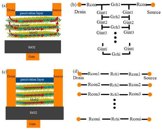 (a) current flow in top-contact structure MoS2 FET; (b) channel resistance model of top-contacted structure MoS2 FET; (c) current flow in edge-contacted structure MoS2 FET; (d) channel resistance model of edge-contacted structure MoS2 FET.