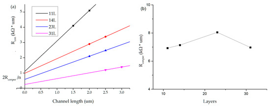 (a) use TLM Solve the per contact resistance (Rconper) of different layers; (b) per contact resistance vs. different layers.