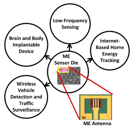 Wireless devices with minuscule size, low power requirements, and low cost are in high demand for a variety of operating frequencies and emerging applications. Magnetoelectric (ME) antennas enable these features and are feasible for compact biomedical and wearable devices with the capability to sense small magnetic field variations at low amplitude (picoTesla to milliTesla) and low frequencies (DC to several kilohertz), which is typically a challenging task due to the abundance of environmental noises in this frequency range.