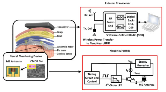 - Zaeimbashi, M.; Lin, H.; Dong, C.; Liang, X.; Nasrollahpour, M.; Chen, H.; Sun, N.; Matyushov, A.; He, Y.; Wang, X.; et al. NanoNeuroRFID: A Wireless Implantable Device Based on Magnetoelectric Antennas. IEEE J. Electromagn. RF Microw. Med. Biol. 2019, 3, 206–215. [Google Scholar] [CrossRef]