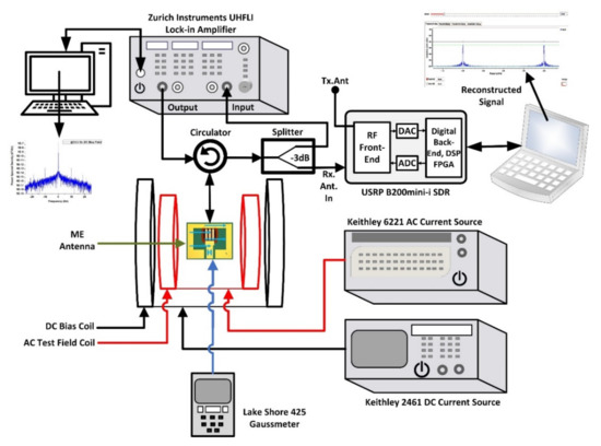 Figure 3 displays the experimental setup for low-frequency magnetic field sensing using an ME antenna as a sensor and an SDR as a receiver. The magnetic sensing was initiated via a strain response of the magnetic material in the ME antenna when exposed to an external AC magnetic field. An AC current source with a controllable magnitude and frequency generated the AC field through a small Helmholtz coil, whereas a DC bias field was applied through a DC current source connected to a larger Helmholtz coil. The orientation of the DC bias field was placed perpendicular to the length of the resonator to maximize the magnetoelectric coupling coefficient and sensitivity. The alternating magnetic field was in the same direction as the DC bias field. Furthermore, the ME antenna was excited by a sinusoidal voltage from the ultra-high-frequency lock-in (UHFLI) amplifier at a certain carrier frequency. Due to the ME effect and the non-linear properties of the magnetic material, the ME sensor produced an amplitude modulated signal [14]. The circulator and splitter configuration in Figure 3 were used to receive the returned signal from the ME sensor with the SDR, while simultaneously monitoring it with the lock-in amplifier. SubMiniature version A (SMA) connectors and cables were utilized for the connections in the measurement setup. The magnetically amplitude-modulated received signal was amplified and down-converted by the RF front-end of the SDR and further processed in its DSP to extract the signal components that carry the ultra-low-magnitude AC magnetic field information sensed by the ME antenna.