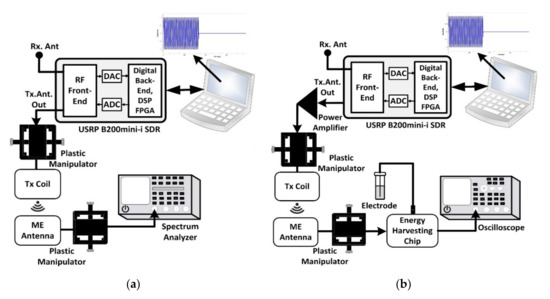 Experimental setup for energy harvesting with an ME antenna excited by the SDR: (a) test arrangement for power transfer efficiency (PTE) measurements; (b) test arrangement to characterize the energy harvesting capability.