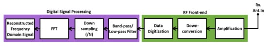 To prototype the sensing with the ME antenna under wired conditions as shown in Figure 3, the SDR parameters were configured for an RF center frequency of 135 MHz, a receiver gain of 16–49 dB, and a sampling rate of 1 MHz. As depicted in Figure 5, the received signal was amplified and down-converted to produce a 12-bit digitized baseband signal with in-phase and quadrature-phase components. The signal was then processed in the DSP unit to extract the amplitude modulation component with a band-pass filter centered around 1 kHz with a 100 Hz bandwidth. Afterwards, the signal was down-sampled to reduce the sample rate by a factor of 5 prior to reconstructing it with a fast Fourier transform (FFT) having a length of 32,768.