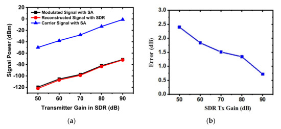 (a) Results from power measurements with a spectrum analyzer (SA) and the SDR (set to 61 dB receiver gain); (b) measured error vs. SDR Tx gain.