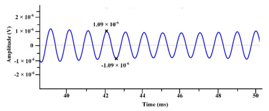 Figure 7 displays the reconstructed frequency domain 1 kHz signal component from the electromagnetic modulation of the ME antenna using the sensing test setup in Figure 3. The reconstructed 1 kHz frequency domain signal had a power of −109.8 dBm captured with a 61 dB SDR receiver gain. From the data in Figure 6a, the reconstructed 1 kHz signal component, measured while using the SDR as a transmitter and receiver, had a power of −107.3 dBm with 61 dB SDR receiver gain. The 2.5 dB difference between these two scenarios is strongly influenced by the variations of losses in the passive RF components in Figure 3. Note that the attenuation due to losses can be compensated by increasing the SDR’s receiver gain by approximately 2.5 dB, which would require a sensor calibration measurement with a known magnetic field strength prior to using it. Table 1 summarizes the ME antenna and SDR receiver parameters and measurement results from the test set-up shown in Figure 3. Figure 8 displays the 1 kHz time domain signal component captured after the SDR receiver operations. The 1 kHz signal had a 2.1 µV peak-to-peak voltage and was received with the same SDR receiver settings as described for the reconstructed frequency domain information.