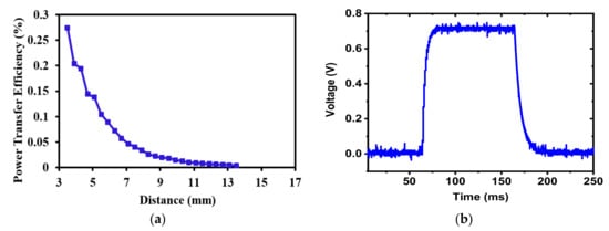 Energy harvesting measurements: (a) PTE vs. distance; (b) transient output with electrode load (100 ms Tx pulse width).