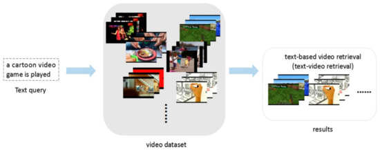 Here, as it is known, text and video are heterogeneous information; they cannot directly find their nearest neighbor as easily as single modality task. In order to solve this problem, traditional concept-based methods [1,2,3,4,5] transform the cross-model retrieval task into a series of detection tasks. As current researches have made some achievements in object detection domain, many mature deep neural network (DNN) models can be used. All of these kinds of methods select information from the input text query as target entities. Then, the pre-trained classifiers like Faster R-CNN [6] and Mask R-CNN [7] are used to detect these concepts in video content. By fusing all scores, the task of video retrieval is completed. However, concept-based methods meet several difficulties. As a natural language, the text query has semantic complexity, so when we specify some concepts from a whole text query, it is crucial to select relevant and detectable concepts more accurately [8]. Simply choosing words or phrases as targets may lose rich semantic information and cannot extract the implicit concept well, so that it leads to the decline of retrieval accuracy. For example, a query “a band is performing in a small club”, the word “performing” in this sentence more likely means singing songs, playing the guitar or playing the drum while with small probability means dancing. So, if we choose “performing” as an action concept to detect in video dataset, the result cannot well match this query.