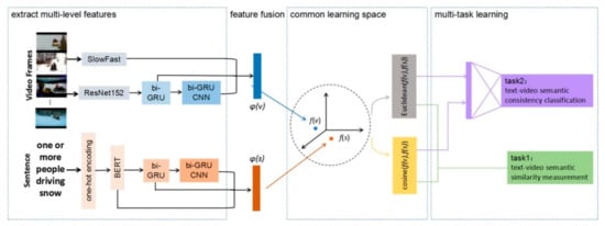 Considering the problems above, this paper proposes a multi-level and multi-task learning based on semantic association to deal with text-video retrieval. Our framework uses the dual multi-level encoding structure [10]. It extracts the multi-level semantic features considering context relevance from the text and video input respectively. Then, it constructs the shared feature subspace with semantic maintenance. By feature mapping, we can transform the two model representations into the same dimension, which makes it easier to compare and measure the cross-modal similarity. In addition to similarity measurement, the multi-task learning model is formed to align the features of different modalities by combining semantic consistency hard classification task. Figure 3 illustrates the framework of our method. In this paper, experiments are carried out on the existing public datasets Microsoft Video Description dataset (MSVD) and MSR-Video to Text (MSR-VTT), and all the results show the effectiveness of the proposed algorithm.