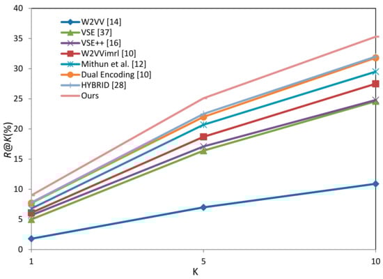 In addition to mAP evaluation, R@K is also a public metric reflecting the performance of the model. Figure 4 and Figure 5 show the R@K curves of different methods on two datasets. By analyzing the trend of all single curves, we can see that R@K is higher with the larger range of K. It shows that the recall rate in top 1 of text video retrieval task is not high, but it will be improved when we calculate in the top 10 or top five results. Furthermore, comparing the increase from R@1 to R@5 with the increase from R@5 to R@10, it is easy to find that the improvement between R@1 and R@5 is significantly greater than between R@5 and R@10. This shows that more correctly retrieval appear in the top five results. By analyzing R@K in different methods, it is known that the higher mAP, the higher R@K. Our approach gets the best R@K in both datasets. The results are consistent with the conclusion by mAP, which fully proves the effectiveness of our method again.
