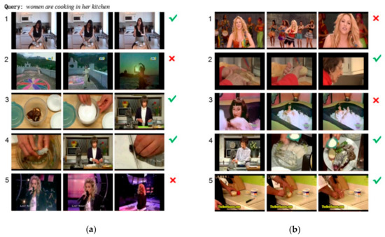 Top five video shots returned on MSVD dataset with a query. (a) is our method and (b) is dual encoding. The video clip with in green means correct result, with in red means error.