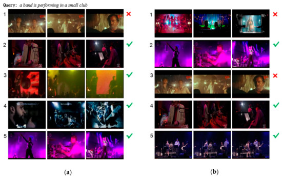 We randomly select a query text on the corresponding dataset and display the top five video shots from the returned retrieval results, as shown in Figure 6 and Figure 7. The left video shots correspond to our multi-task cross-modal retrieval method, and the right is dual encoding [10]. In the sample query, the top-1 result of dual encoding in either dataset is wrong, while our method is also in error in MSR-VTT, but retrieves correctly in MSVD. Observing the top five results returned, there are more videos matching the query text. Combined with R@K evaluation analysis above, it can be seen that the value of R@1 for any model is low, but the rate of R@5 is two to three times that of R@1, as shown in Figure 4. As a result, the top-1 shot cannot be correctly matched with the query text, and the retrieval error rate is higher. However, once the requirement is adjusted to the top five, there are more relevant items. According to Figure 6, for the query text “women are cooking in her kitchen” on the MSVD dataset, our method, with the top-1, top-3 and top-4 correct results, performs better than the results of dual encoding, of which the top-2, top-4 and top-5 results are right. In the same way, the sample query text is “a band is performing in a small club” in Figure 7. Our method has an error only in the top-1 video, while the dual encoding has in both the top-1 and top-3. The examples of visualization more intuitively show the performance of our method.