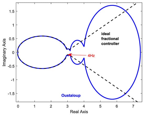 Finally, a stability analysis based on the Nyquist criterion was performed. The Nyquist plot of the designed ideal (non-approximated) non-integer controller is presented in Figure 3 with a dashed line. Fractional controller parameters for these systems have value: , , and . As we can see, these parameters fully meet the assumptions.
