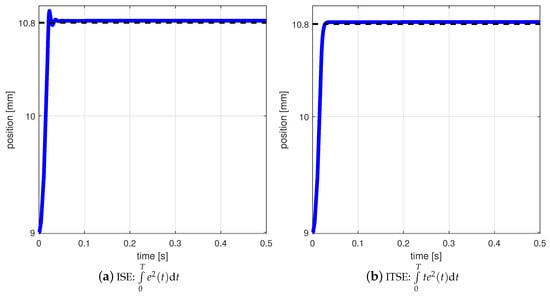 where . We use all of these qualities’ indicators because have different properties. ISE is one of the most used quality indicators. Since it is simple to use, it provides good results and in many cases can be calculated analytically. Its disadvantage is that it favors large errors, which means that, in the tuning process of the controller, errors at the beginning of the control process will have a greater impact on this process.