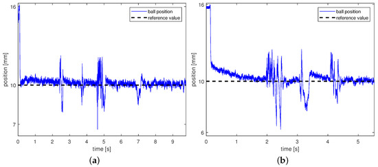 (a) Ball position stabilization process with controller tuning by the analytic method, (b) ball position stabilization process with controller tuning by the SA method. (a) shows the process of stabilizing the position of the ball under the electromagnet with regulator tuning by the analytic method. The regulation time is approx. 1.5 s. The maximum overshoot is approx. 6 mm. When the working point is reached, vibrations are noticeable in its vicinity; (b) shows the process of stabilizing the position of the ball under the electromagnet with controller tuning by the SA method. The regulation time is approx. 2 s. There is no overshoot here. When the working point is reached, vibrations are noticeable in its vicinity.