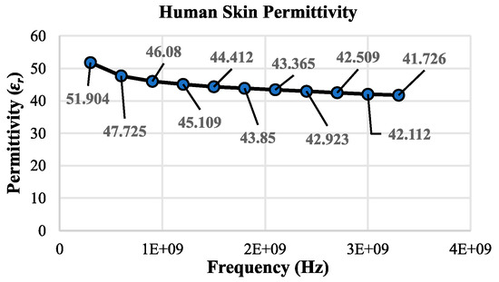 The human skin permittivity values at 0.3–3.3 GHz (in the base unit Hz), generated based on the available data reported in [29,30].