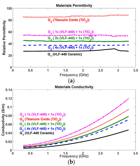 The measured electrical and dielectric properties of VLF-440, TiO2, and their mixtures at 0.3–3.3 GHz: (a) the measured permittivity plots. (b) The measured conductivity plots.