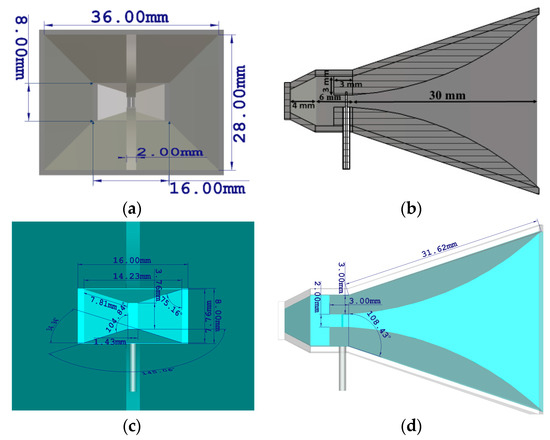 Furthermore, the pyramidal double-ridged horn (PDRH) antenna was designed in 1964 [17,18], though the ridged-waveguide was introduced earlier in 1947 [19]. This antenna is widely used in radar systems, due to its wide bandwidth, high gain, and high directivity. Due to its characteristics, this antenna is an efficient solution compared to the other bidirectional types, e.g., bowtie, Vivaldi, and wire helix. Despite its benefits, it suffers from a few disadvantages, e.g., the network mismatch when it is placed on the human body, as well as the large aperture at low microwave frequencies. The latter is of importance in diagnostic scans due to the penetration depth factor [20].