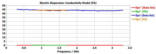 Furthermore, Figure 6a,b depicts the dimensions for the accurate hybrid full-wave modeling. Figure 6c,d presents the dimensions of the embedded ceramic, designed based on the measured data from the fabricated mixture material that was loaded into the CST Studio Suite. This software was used to remove the minor errors introduced during the measurements based on performing the curve fitting techniques on the loaded data as in Figure 7. The mixture was further selected as the background material in the software, to effectively evaluate the dielectric medium. Additionally, the high-performance computing (HPC)-based full-wave simulations were conducted, using the robust time-domain transient solver. This hybrid numerical and experimental modeling were rigorously performed, in order to evaluate the characteristics of the proposed system, and to further replicate the practical scenarios [35]. In addition, the main figures of merit, including the reflection coefficient (S11), far-field radiation pattern, and gain were obtained, as depicted in Figure 8a–c, respectively. The S11 plot shows the wide bandwidth of 536 MHz, in the range of 0.91 GHz to 1.44 GHz, with −10 dB as the selected reference, along with the two large reflections at the low frequencies of 0.99 GHz and 1.29 GHz. Also, the far-field radiation patterns, as in Figure 8b, present the operation of the embedded ceramic antenna at both the largest reflection frequencies that exhibit promising directivity, when the device was placed on the body. Figure 8c also presents the high gain values for the proposed antenna over the frequency range of interest at two reflection points (i.e., 0.99 GHz = 7.7 dB and 1.29 = 9.4 dB). This result was successfully achieved by incorporating the low-conductive material into the performed hybrid modeling, which resulted in the significant shrunk size, as well as the improved matching.