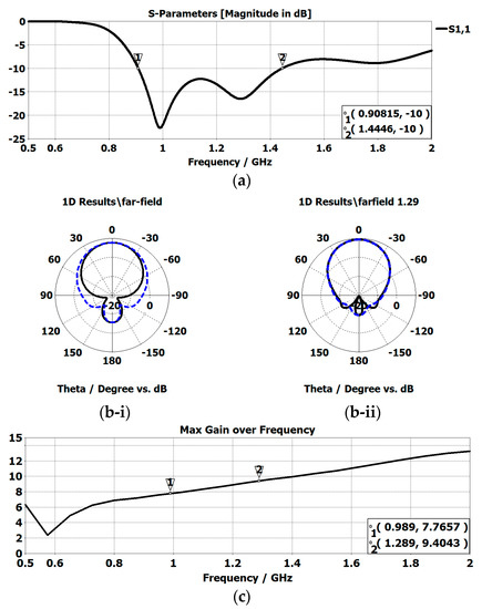 The output EM characteristics of the antenna system: (a) the S11 plot in the skin-matched dielectric medium, (b-i) the radiation patterns at 0.99 GHz with −13.5 dB sidelobe levels (SLLs). (b-ii) The radiation patterns at 1.29 GHz with −18.5 dB SLLs. (c) The maximum gain. It is worth noting the border between the near-field and far-field regions is indistinguishable for the monitoring purposes, due to the electrical properties of the developed microwave antenna device.