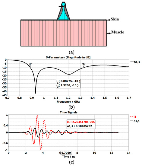 The human arm model, consisting of two layers of 2 mm skin and infinite muscle, was defined based on the assumption that the pulse is absorbed within the muscle layer, as depicted in Figure 9a. In addition, the Gaussian pulse with the frequency and bandwidth of 1 GHz was then generated as a transmitted pulse, due to its penetration capability and high resolution. It should also be noted that the electrical properties of the tissue layers were imported from the database within the CST.