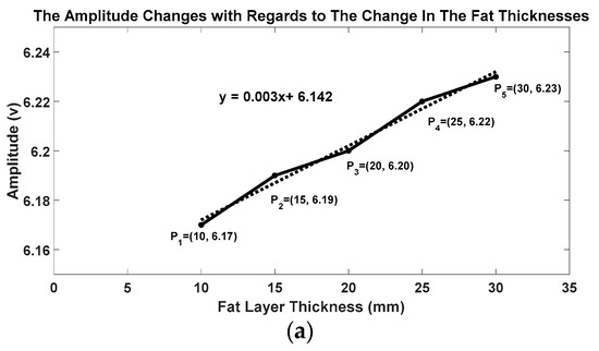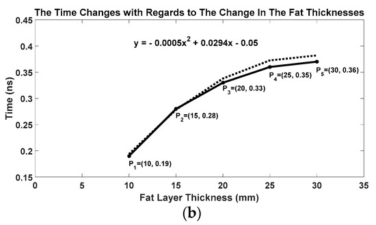 The highest amplitude of the reflected pulse was also observed in the screening time window of 6 ns to 7 ns, which is the arrival window time of the reflected pulse. The thickness of the fat layer was changing from 15 mm to 30 mm, and the highest reflected points of the amplitude and time within the screening window (i.e., o1 to o5 shown in Figure 10b) were fully recorded for each reflection, and are given in Table 4. The S11 plots were obtained for these cases when the fat thicknesses were changing from 15 mm to 30 mm, which shows the relative changes in terms of the magnitude and frequency shift, as presented in Figure 10c. Table 4 was further employed to obtain the estimated equations for the amplitude change, and the time shift, when the thickness values were changing from 15 mm to 30 mm, as depicted in Figure 11a,b, respectively. The presented hybrid EM framework, as well as the generated closed-form analytical expressions, can be used to measure the abdominal fat, and to be further used in the different bioinstrumentation and biosensor components, designs, and applications.
