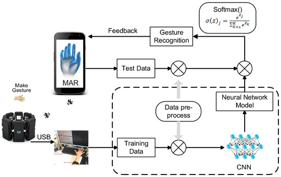 The schematic diagram of the mirror therapy system based on multi-channel SEMG signal pattern recognition and mobile augmented reality is shown in Figure 1. A wearable device is employed as the gesture sensor to collect the SEMG signal data. Besides, the training data is transmitted to the personal computer when it is in the training mode. After pre-processing or analysis, the CNN is designed to train the classification model. While it is in the test mode, the test data is sent to the mobile terminal before the data is used for features extraction and action matching after pre-processing. The determined results are fed back to the mobile side. After the processing of AR on the mobile terminal, users can see the movement they are trying to do.