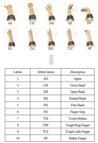 As a device widely used for gesture recognition and manufactured by Thalmic Labs, MYO has eight interconnected stainless-steel sensor components. In this study, the MYO armband is used as a data acquisition device, and a total of 10 types of SEMG signal data for gesture motion are sampled. The sampling frequency for each type of gesture motion is 100 Hz with a relaxing time of 3 s between two motions completed by the subject. The 10 types of motions are defined in Figure 3.