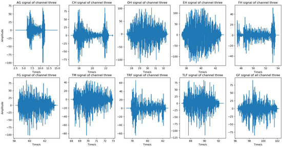 The data segment is necessary to study every single gesture, and a window is added to get the rough range. After that, data smoothing is done to obtain the absolute maximum value, we choose 20% of the maximum as the boundaries for both left and right. The wave of channel three’s 10 single gestures is shown in Figure 4.