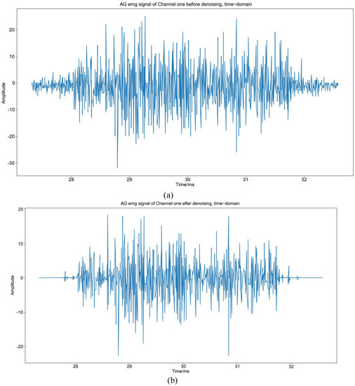 (a) The AG SEMG raw signal; (b) AG SEMG signal of channel one after wavelet transform noise reduction.