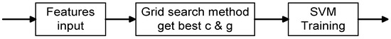 In the SVM training process, the penalty parameter c and the kernel parameter g need to be optimized to select the best parameter. In this paper, Cross Validation (CV) combined with grid optimizer was used to obtain the best parameters of c and g. Figure 6 shows the processing flow of the grid optimized SVM.