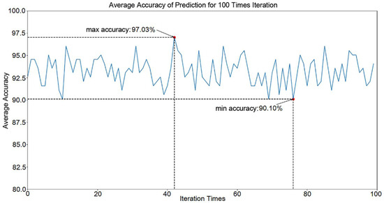 In Figure 7, every average accuracy of the iteration for 100 times is drawn in the line chart. It shows the maximum average accuracy in the iteration for 100 times is about 97.03%, and the minimum average accuracy is about 90.10%. Since our test data set and train data set of each iteration is chosen randomly, this result is more reliable. In that case, the performance of the grid optimized SVM performs well during the classification.