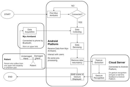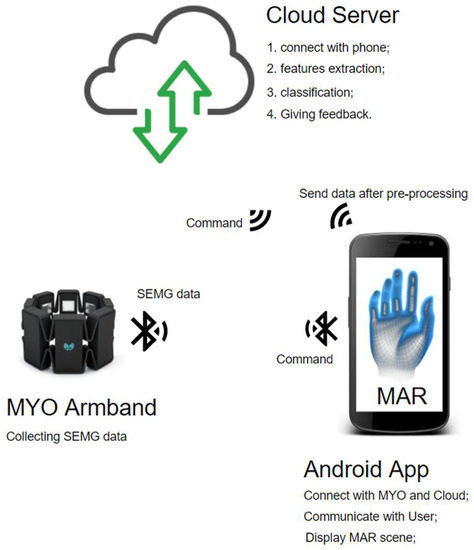 The designed mirror therapy system structure is shown in Figure 10. The wearable device MYO is connected to the mobile phone via Bluetooth. When the user is exercising a certain finger pair movement for rehabilitation training, MYO will collect the SEMG signal data which is then transmitted to the software designed in the mobile terminal. After the pre-processing or analysis, the data is sent to the cloud server for feature extraction and action matching. The cloud server saved the trained classification model before it determines the type of action and offers an instant feedback to the mobile side. The mobile-side software then plays the corresponding finger pair movement at the receipt of the feedback, and users can see the movement that they are trying to do through the mobile augmented reality which provides a virtual hand movement in the real environment and on the real arm, so as to accomplish the mirror therapy process.