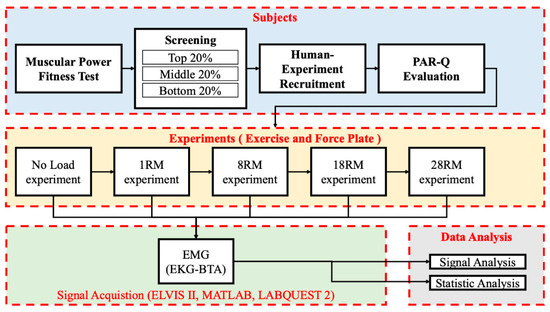 Figure 1 shows a flowchart of the experiment undertaken in this study. The experiment involved participants (three groups), exercises (no load, 8RM, 18RM, and 28RM), force plate experiments (no load, 8RM, 18RM, and 28RM), EMG signal acquisition, and data analysis (signal and statistic). Each subject performed the exercise experiment and force plate experiment at no load, 8RM, 18RM, and 28RM activity levels on a Smith machine. After each exercise, the participant was given 3 min of rest. The exercise experiment and force plate experiment included the following steps: