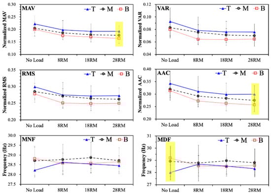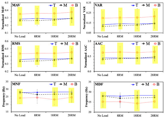 Table 2 and Figure 2 show the results of MAV, VAR, RMS, AAC, MNF, and MDF and statistical analysis in no load, 8RM, 18RM, and 28RM exercise experiment. As seen in the upper left panel of Figure 2, the mean MAV exhibited a similar pattern for all groups (T > M > B) in all exercise experiments. No significant MAV differences were discovered between the groups in the no load, 8RM, and 18RM exercise experiments; however, significant differences were found between all groups in the 28RM exercise experiment (p = 0.018). As seen in the upper right panel of Figure 2, the mean VAR exhibited a similar pattern for all groups (T > M > B) in all exercise experiments. No significant VAR differences were found between any groups in the no load, 8RM, 18RM, and 28RM exercise experiments. As shown by the left middle panel of Figure 2, the mean RMS exhibited a similar pattern for all groups (T > M > B) in all exercise experiments. No significant RMS differences were discovered between any groups in the no load, 8RM, 18RM, and 28RM exercise experiments. The right middle panel of Figure 2 indicates that the mean AAC exhibited a similar pattern for all groups (T > M > B) in all exercise experiments. No significant AAC differences were obtained between any groups in the no load, 8RM, and 18RM exercise experiments; however, a significant intergroup difference was found in the 28RM exercise experiment (p = 0.021). As indicated in the lower left panel of Figure 2, the mean MNF differed between groups in all exercise experiments. No significant MNF differences were found between the groups in the no load, 8RM, 18RM, and 28RM exercise experiments. The lower right panel of Figure 2 shows that the mean MDF differed between groups in all exercise experiments. No significant differences were discovered between any groups in the 8RM, 18RM, and 28RM exercise experiments; however, a significant difference was performed in the no load exercise experiment (p = 0.039).