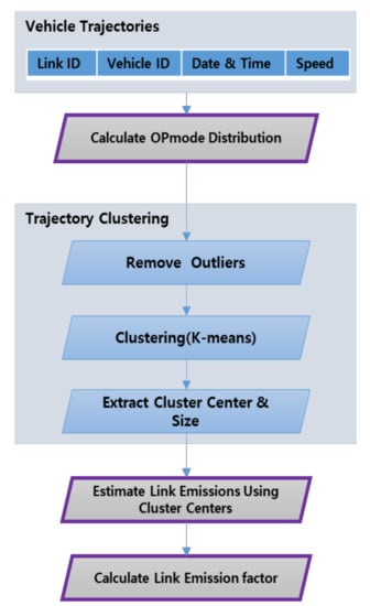 Figure 1 is a diagram showing the procedure for estimating the micro-level link emission factors required to calculate the emissions at the network level by using the collected vehicle trajectory data. The following section explains each process in detail.