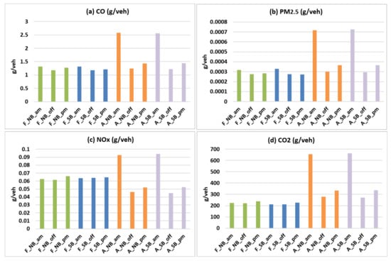 The micro-level link emission factors are calculated by emissions from vehicles in all clusters, which are B columns in Table 3 by the number of vehicles (the number of vehicle trajectories), and summarized in Table 4. These values are the micro-level emission factors of the passenger car at the analysis time interval on the analysis link for each pollutant. As shown in Figure 3, plotting these values through bar graphs can determine whether the estimated micro-level link emission factors can appropriately reflect the emission characteristics of the link. The emission factors show the highest trend in the morning peak hours and the lowest in the non-peak hours, indicating the change in emissions according to time periods of the link. Even though the driving length of the highway (about 1 km) is longer than that of the arterial road (about 600 m), the emissions are lower on the highway, which indicates that the emission factors appropriately reflect the driving characteristics by the road characteristics (uninterrupted flow and interrupted flow) of the link.