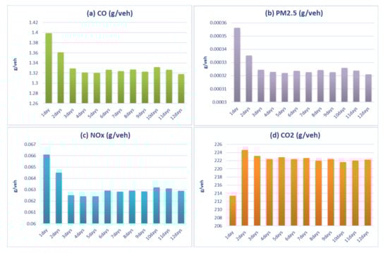 Table 7 summarizes the micro-level emission factors for each pollutant estimated by adding the number of data collection days. The bar graphs plotted in Figure 5 show that the micro-level emission factors tend to converge as the number of days of data accumulation increases. It means that the estimated micro-level link emission factors’ representativeness increases as the data is accumulated.