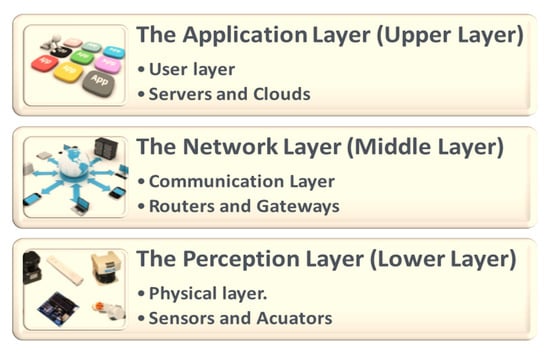 The Internet of things (IoT) comprises a collection of heterogeneous resource-constrained objects interconnected via different network architectures, such as wireless sensor networks (WSNs) []. These objects or “things” are usually composed of sensors, actuators, and processors with the ability to communicate with each other to achieve common goals/applications through unique identifiers with respect to the Internet protocol (IP) [,]. Current IoT applications include smart buildings, telecommunications, medical and pharmaceutical, aerospace and aviation, environmental phenomenon monitoring, agriculture, and industrial and manufacturing processes. The basic IoT layered architecture is shown in Figure 1. It has three layers: the perception layer (consisting of edge devices that interact with the environment to identify certain physical factors or other smart objects in the environment), the network layer (consisting of a number of networking devices that discover and connect devices over the IoT network to transmit and receive the sensed data), and the application layer (consisting of various IoT applications/services that are responsible for data processing and storage). Most cyber-attacks target the application and network layers of the IoT system.