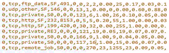 Lately, the original KDD’99 dataset [] has been re-investigated and updated to include more up-to-date and non-redundant attack records with different levels of difficulty through the newer, reduced version called NSL-KDD [,]. Figure 2 shows sample records of the original NSL-KDD training dataset in the .csv format but read by Notepad in .txt format (prior to any processing technique). In this research, the NSL-KDD dataset was employed for many reasons, as follows: