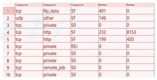 Table 3. Scheme for the replacement of the categorical data of the protocols. - For the service feature, 69 different services were revealed from the dataset, such as “AOL,” “AUTH,” “BGP,” “COURIER,” “CSNET_NS,” …, “UUCP_PATH,” “VMNET,” “WHOIS,” “X11,” and “Z39_50.” The one-hot encoding for this feature replaced the categorical data of the “service column” with the 69 numerical features, as shown in Table 4.