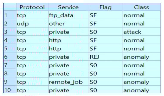 - Renaming categorical features: Four of the imported 43 features are categorical features that needed to be renamed prior to the data encoding and sample labeling processes. These features were the target protocol, the required service, the service flag, and the record category (e.g., normal or attack). Therefore, the four categorical columns were renamed accordingly in this stage. Figure 5 illustrates the four categorical features (columns) that were renamed for the binary-class data records (the other columns are omitted for better readability). Furthermore, note that the dataset encompasses multiclass data records for different traffic categories.