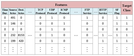 - Labeling the target feature: This stage is concerned with sample labeling using numerical (integer) labels for the target classes. Therefore, the categorical “class column” was converted to numerical classes according to the classification technique. In our system implementation, we considered two forms of traffic classifications: binary classification (1: normal vs. 2: attack) and multiple classifications (1: normal, 2: DoS, 3: probe, 4: R2L, and 5: U2R). After this stage, all data records were available in a numerical format (i.e., no categorical data existed anymore). As a result of 1-N encoding and numerical labeling, we converted the dataset into 123 features and one data label. The results of this stage, i.e., the encoded form of the dataset table of the two-class records, is provided in Figure 6.