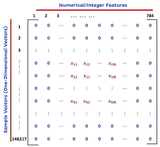 - Matrix resizing with a padding operation: This module is responsible for adjusting the size of the dataset matrix to accommodate the input size for the FL subsystem. This was performed by resizing the matrix of the engineered dataset from 148,517 × 124 to the new size of 148,517 × 784 since the input size of every individual sample processed at the FL subsystem was 28 × 28 = 784. Thereafter, the new empty records of this matrix were padded with a zero-padding technique []. To avoid any feature biasing the samples of the dataset, the padded records were distributed equally around the data samples. Figure 7 illustrates an example of resizing with the zero-padding operation used in this research. The new matrix size was composed of 148,517 sample attacks, each with 784 features.