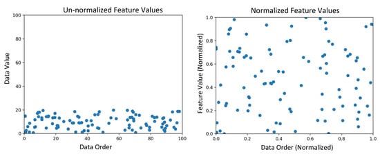 - Matrix normalization with a min-max norm: Data normalization is performed such that all the data points are in the same range (scale) with equal significance for each of them. Otherwise, one of the great value features might completely dominate the others in the dataset. Thus, this module is responsible for normalizing all integer numbers of the dataset matrix into a range between 0 and 1 using min-max normalization (MX-Norm) []. MX-Norm is a well-known method for normalizing data, as it is commonly used in machine learning applications. In this method, we scanned all the values in every feature, and then, the minimum value was converted into a 0 and the maximum value was converted into a 1, while the other values were converted (normalized) into a fractional value from 0 to 1. The min-max normalization for data record at the ith position of matrix X is defined as follows:Furthermore, Figure 8 illustrates an example of the integer data features normalized using min-max normalization (0–1). The effect of normalization can be clearly seen as it ensured all features were at the same scale.