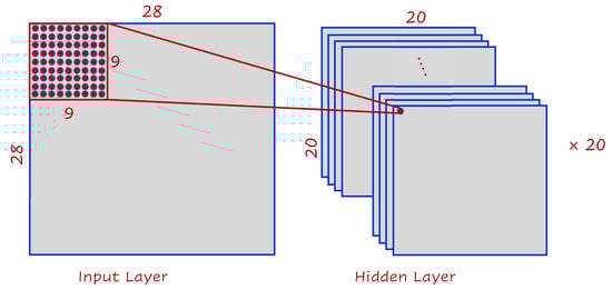In this research, we applied 20 convolution filters (9 × 9) over the 28 × 28 input samples with p = 0 and s = 1, which resulted in 20 feature maps each (20 × 20). Figure 10 illustrates our convolutional layer, where the input was a 28 × 28 matrix and a filter of size 9 × 9, where this defined a space of 20 × 20 neurons in the first hidden layer. This was the case because we could only move the window 19 neurons to the right and 19 neurons to the bottom before hitting the right (or bottom) border of the input matrix. Note that the filter moves forward one position away, both horizontally and vertically, when a new row starts. Furthermore, note that the convolution layer goes through a backpropagation process to determine the most accurate values of its trainable parameters (weights: k × k × N = 9 × 9 × 20).